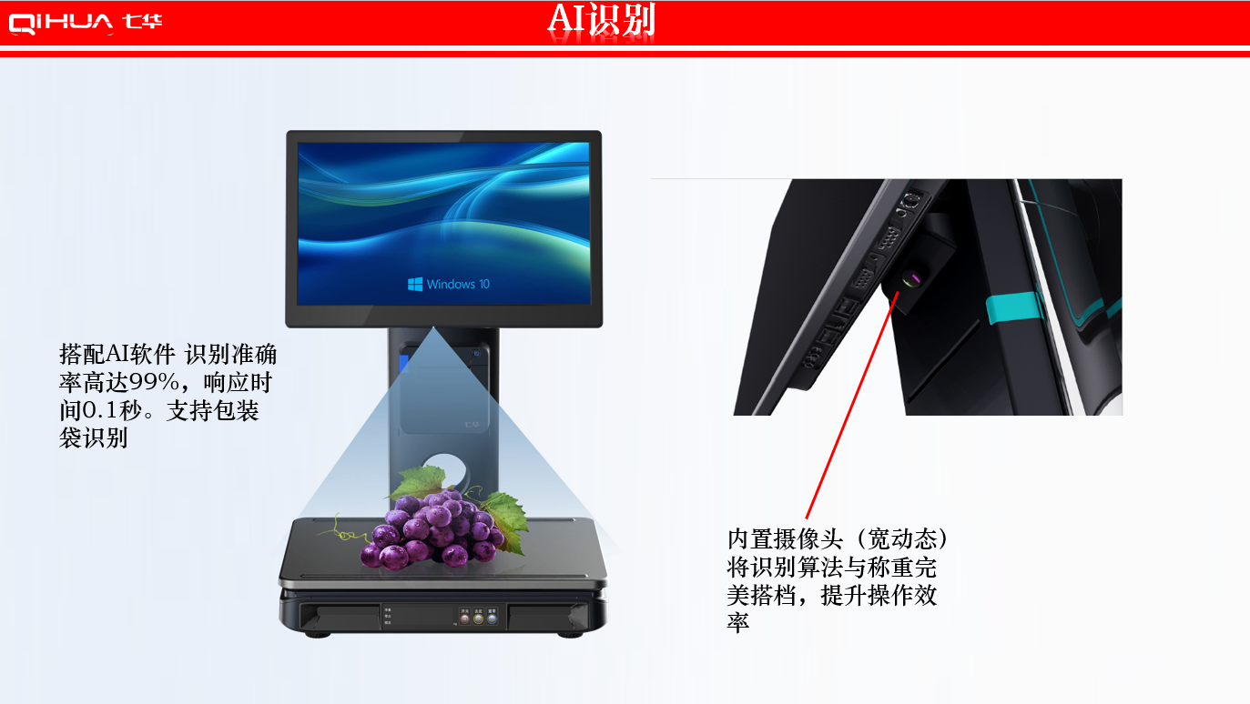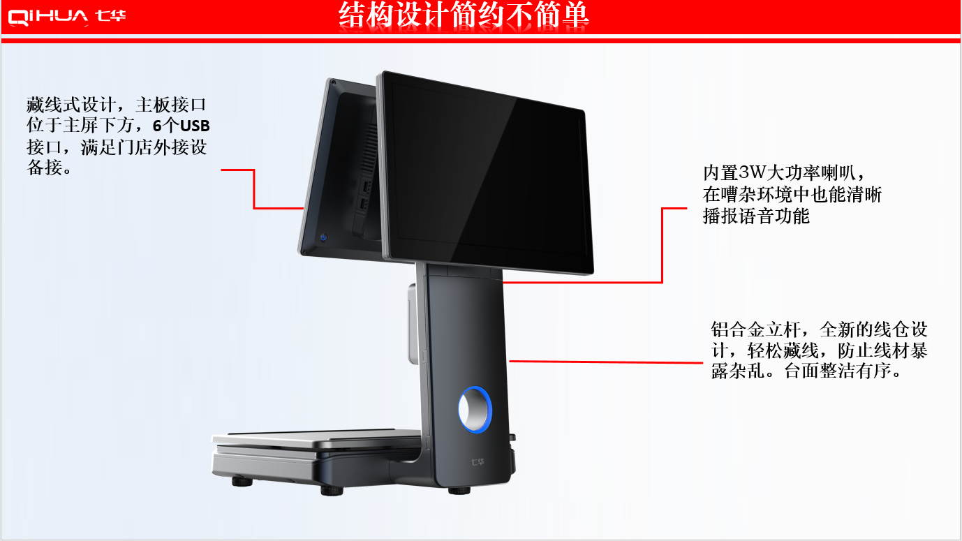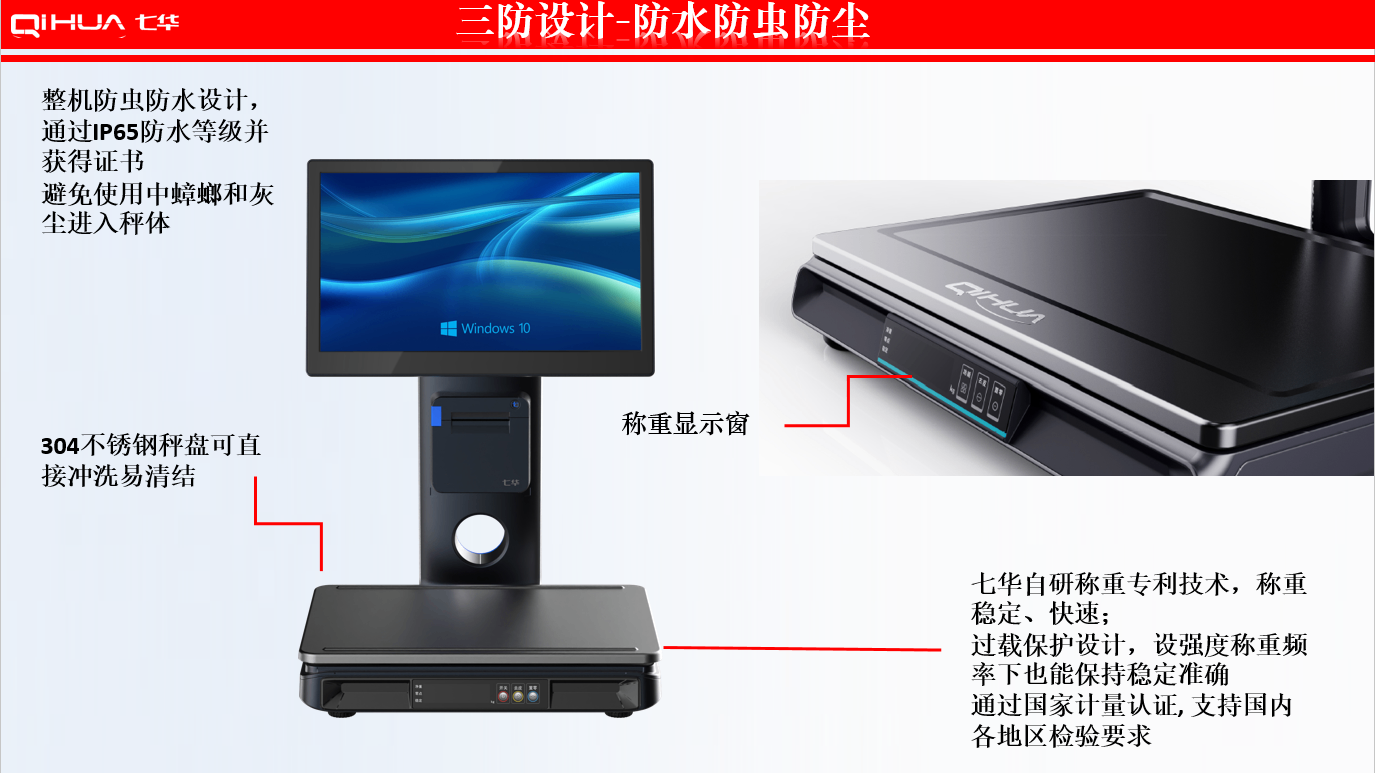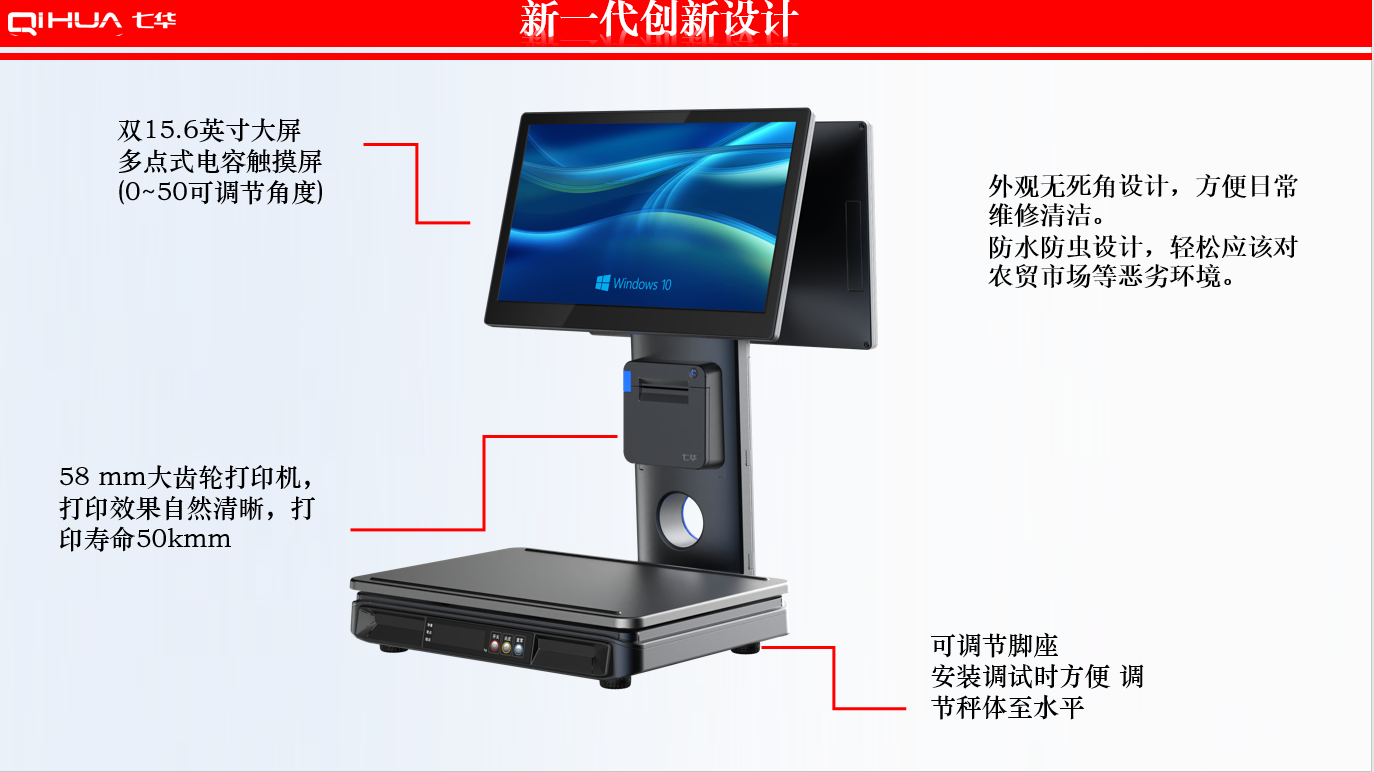 描述:新一代創(chuàng)新設(shè)計,雙15.6英寸大屏,多點式電容觸摸屏可(0~50可調(diào)節(jié)角度)。鋁合金立桿,全新的線倉設(shè)計,輕松藏線,防止線材暴露雜亂。臺面整潔有序。七華自研稱重專利技術(shù),稱重穩(wěn)定、快速;過載保護(hù)設(shè)計,設(shè)強(qiáng)度稱重頻率下也能保持穩(wěn)定準(zhǔn)確;通過國家計量認(rèn)證, 支持國內(nèi)各地區(qū)檢驗要求。外觀無死角設(shè)計,方便日常維修清潔。 防水防蟲設(shè)計,輕松應(yīng)該對農(nóng)貿(mào)市場等惡劣環(huán)境。